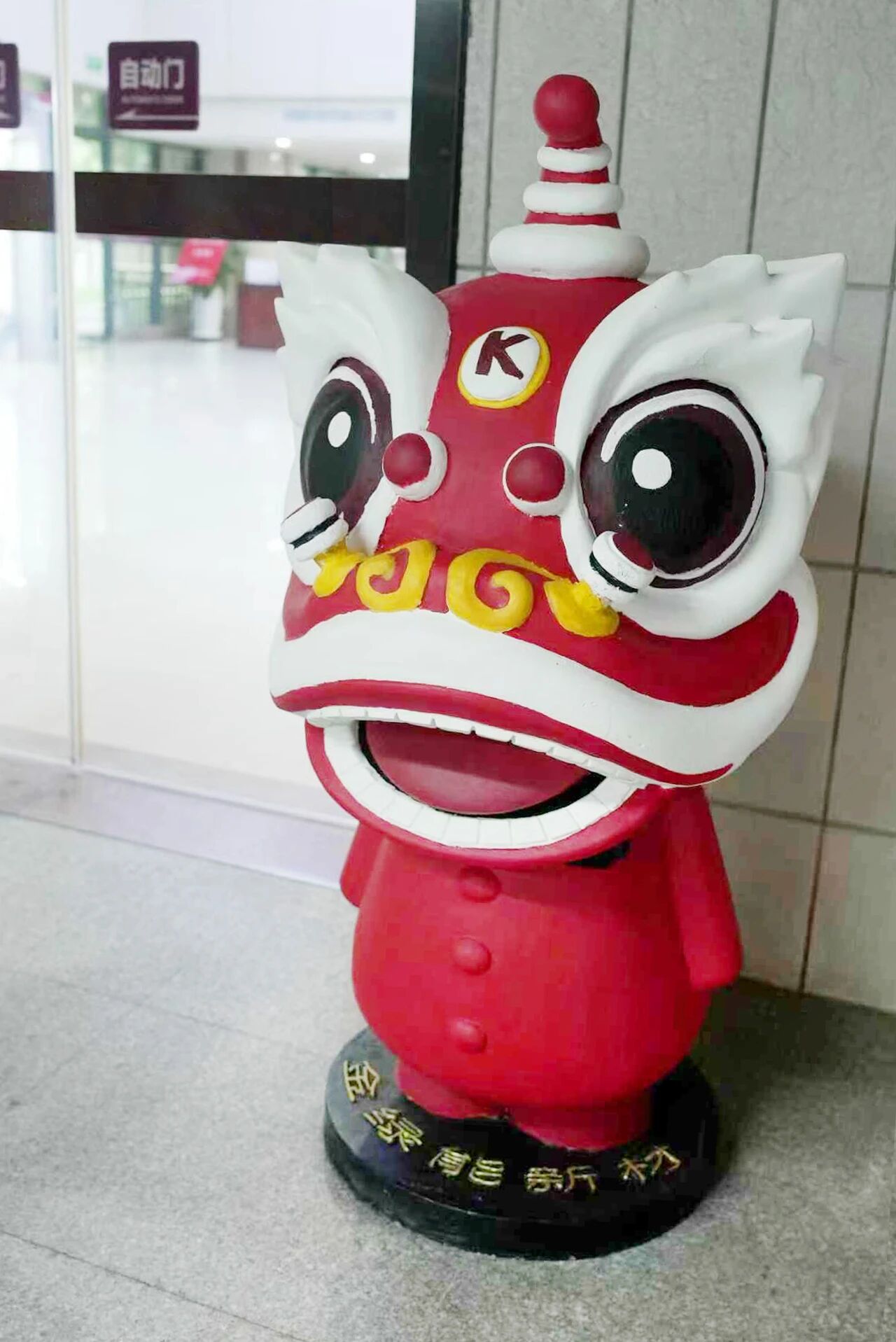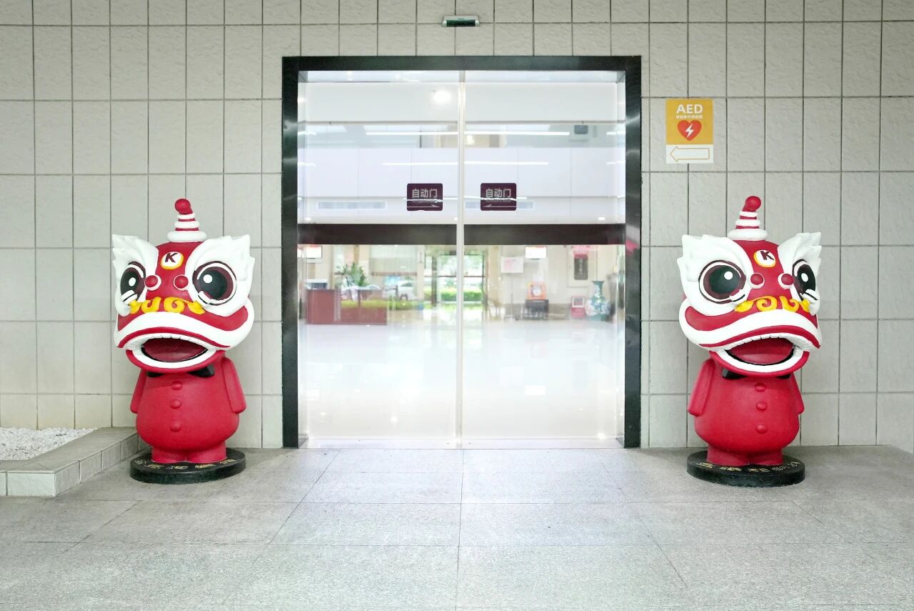 أسدان ذهبيان، مصنوعان أيضًا من السيراميك الرغوي، يتميّزان بسحر خاص. تُجسّد اللدونة الفائقة للمادة كل التفاصيل، محافظةً على طابع السيراميك، مع التعبير ببراعة عن روح رقصة الأسد في فوشان. يُضفي هذان المُرحّبان الفريدان لمسةً حيويةً ومرحةً على المكان.