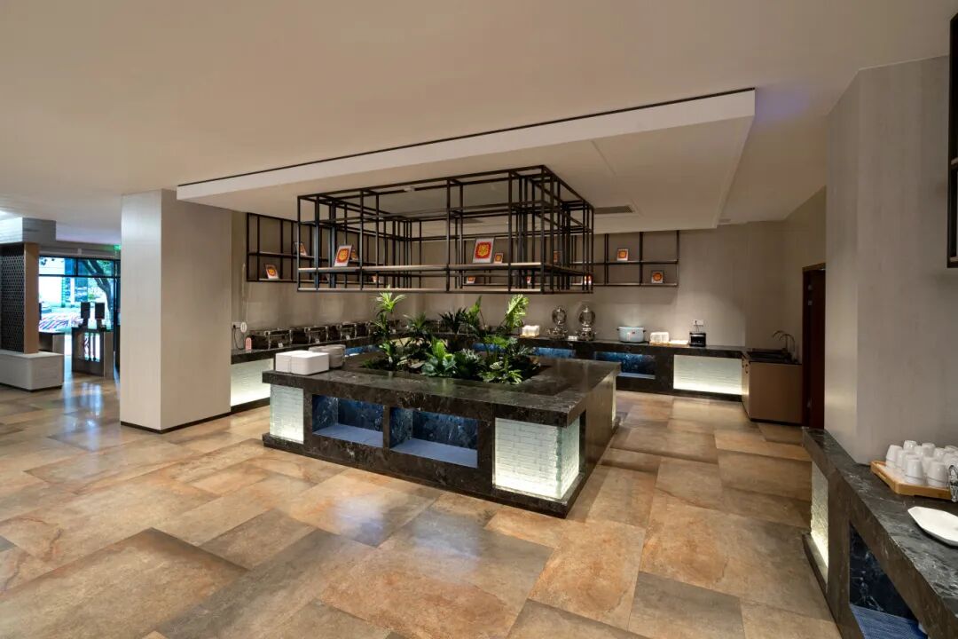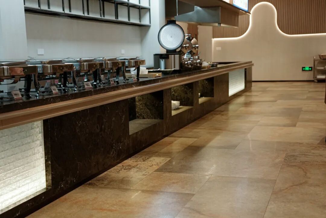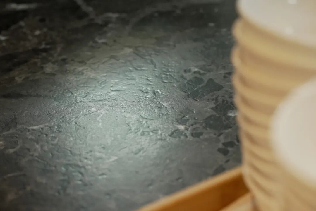 أسطح البوفيه المصنوعة من لون " ميتيوريت بلاك " من KLAX، تضفي لمسةً طبيعيةً أصيلة. خصائصها المقاومة للبقع والاهتراء وسهلة التنظيف تضمن عمليةً عملية. وبينما تُحوّل المكونات المحلية الموسمية إلى أطباقٍ فاخرة، تنبض المساحة بسحرٍ يأسر الحواس الخمس.