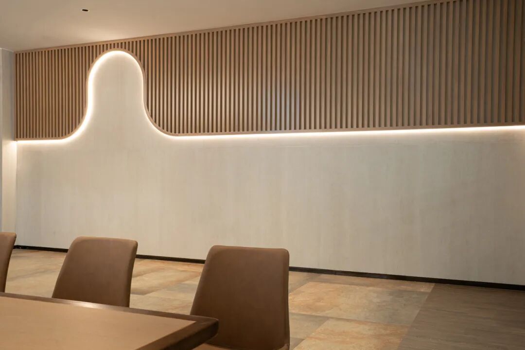 القطعة المركزية هي جدارية "روعة فوي" البارزة، المصنوعة من سيراميك KGE الرغوي. مستفيدةً من خفة المادة ومرونتها، استخدمت KGE تقنية نحت CNC الدقيقة لدمج سحر الفن التقليدي مع الدقة التقنية الحديثة.