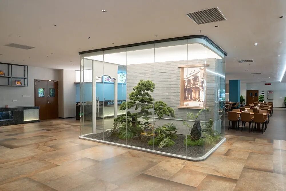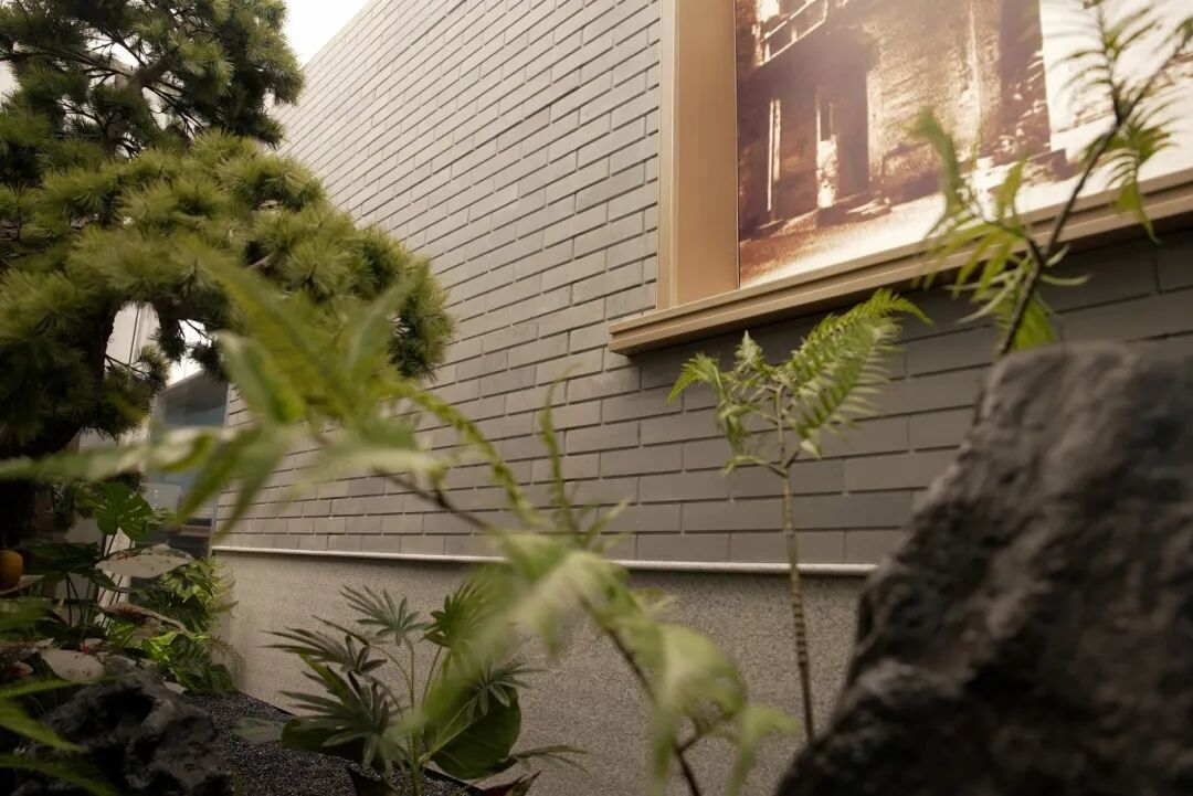 في الداخل، يكشف جدار زجاجي شفاف عن منظر طبيعي هادئ. الجدار، المصنوع من ألواح السيراميك الرغوية من شركة KGE، ينضح بسحر لينغنان الهادئ بفضل لونه الرمادي الريفي وملمسه الناعم.