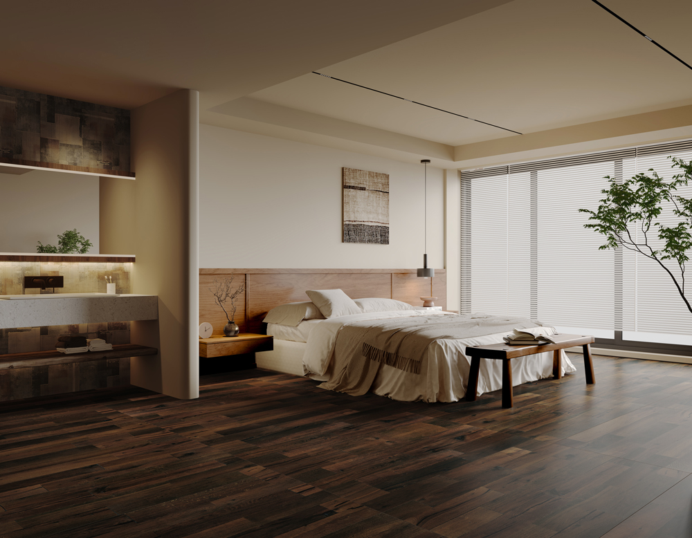 تتألق درجات اللون البني الدافئ والرمادي الداكن العتيق بتدرجات دقيقة من الضوء والظل، إلى جانب درجات لونية حمراء خفيفة. وتضفي الشقوق والعقد العميقة تباينًا جريئًا، مما يعزز الطابع المميز للمجموعة.