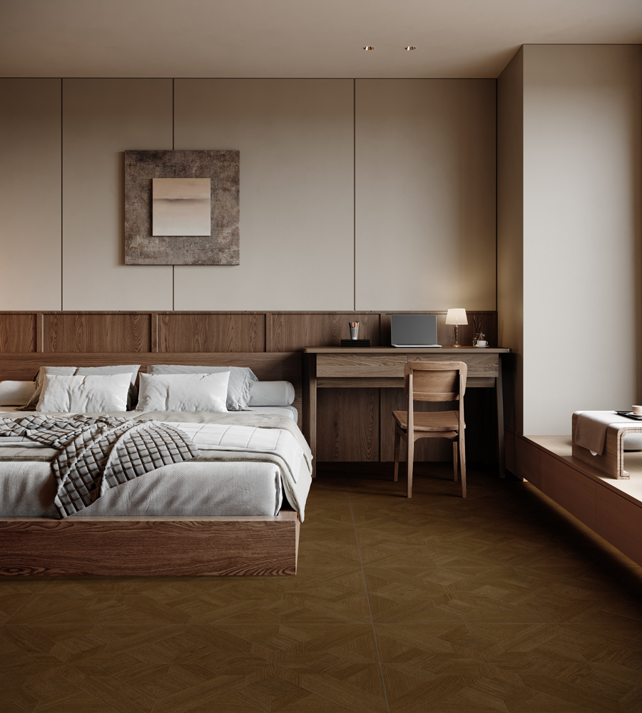 استوحت هذه المجموعة من بلاط الأرضيات "كاراميل وود" تصميمها من أخشاب بروفانس الخريفية ذات اللون الكراميلي، وتتميز بحبيبات خشبية طبيعية واضحة وديناميكية، معززة بأنماط عقد صينية منحوتة بدقة، مما يخلق جوًا يلتقي فيه الجمال الطبيعي بالحرفية الراقية.