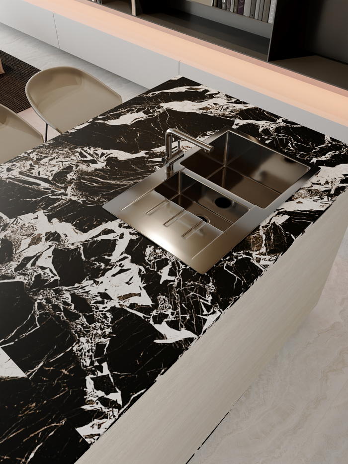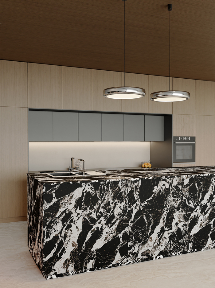 قاعدة حجرية داكنة فاخرة ممزوجة بنقوش أمواج متلاطمة، تنضح ببريق مبهر وإشراقة آسرة. يخلق التباين الشديد بين الأسود والأبيض جاذبية بصرية آسرة، يضفي على المكان طابعًا فاخرًا وأنيقًا.