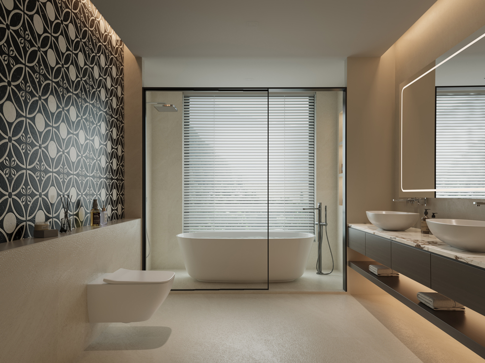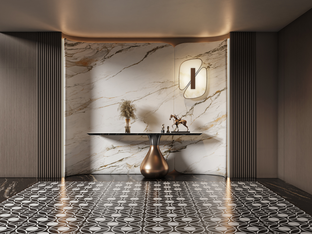 بفضل محاذاة الأنماط العشوائية متعددة الاتجاهات عبر كل بلاطة وتركيب الجص السلس، تخلق هذه المجموعة إحساسًا متواصلًا بالاستمرارية المكانية، مما يوسع التجربة البصرية إلى ما لا نهاية.